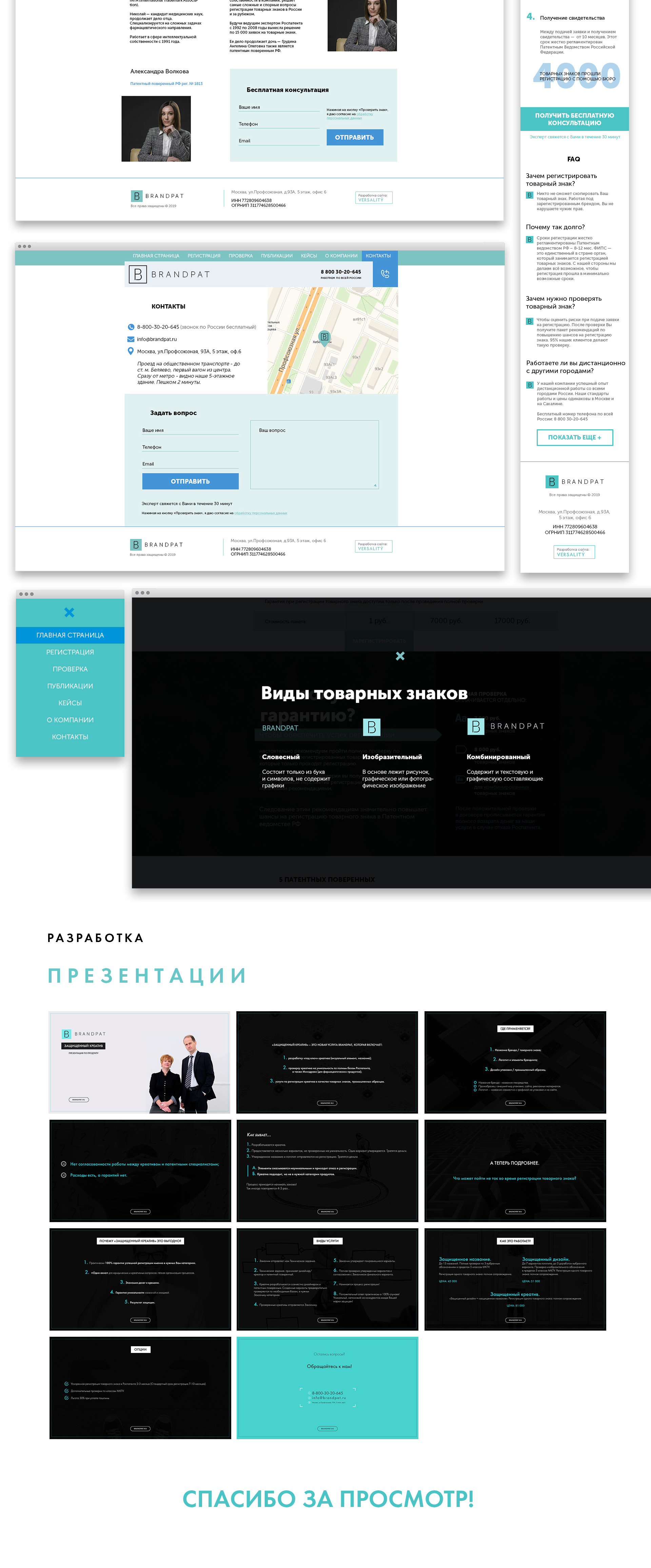 В рамках рабочего процесса была разработана обновленная платформа бренда, презентация для партнеров и корпоративный адаптивный сайт с интеграцией базы зарегистринованных за 8 лет знаков (4000+ номаров и ссылок на сайт Роспатента).